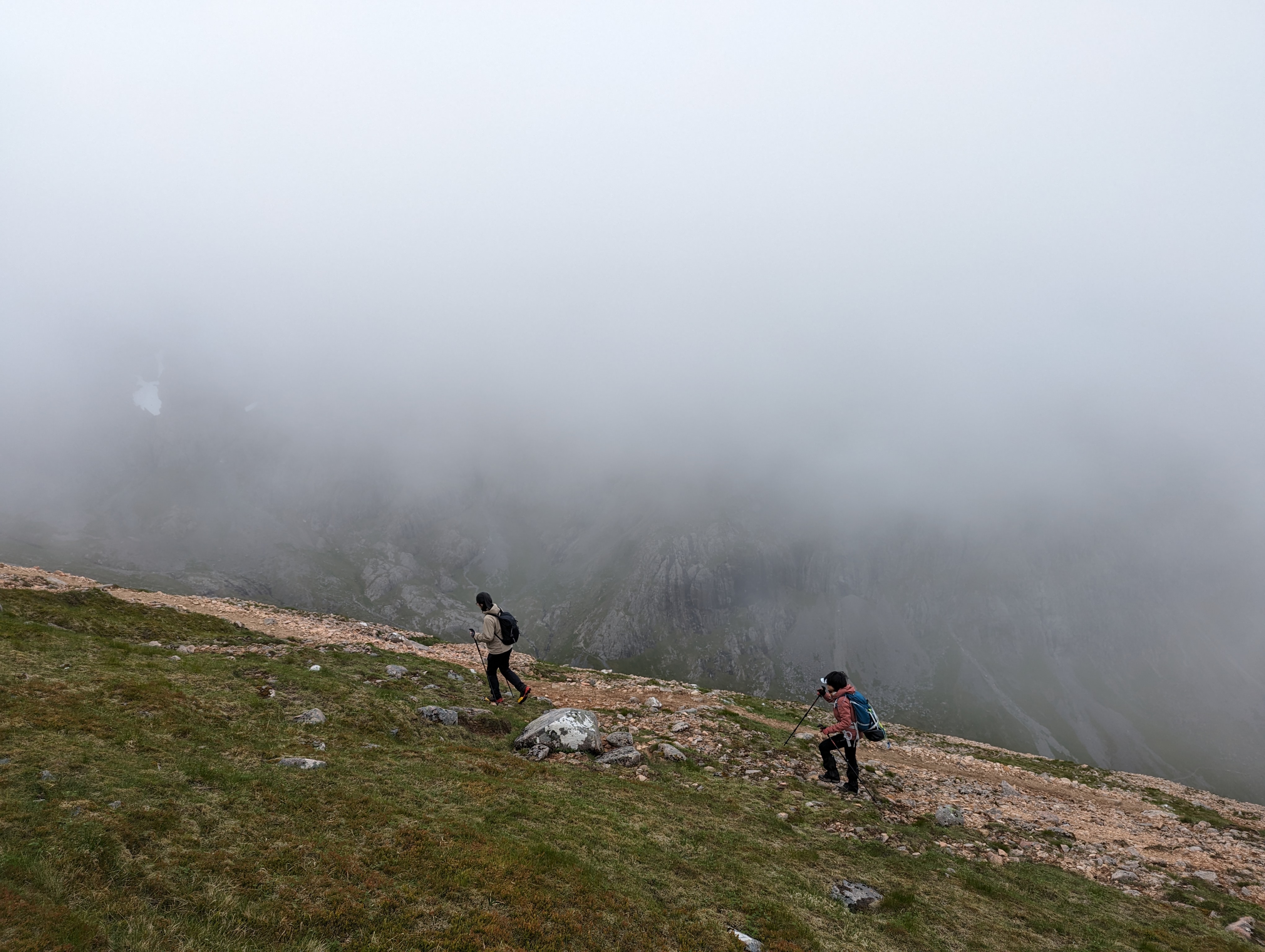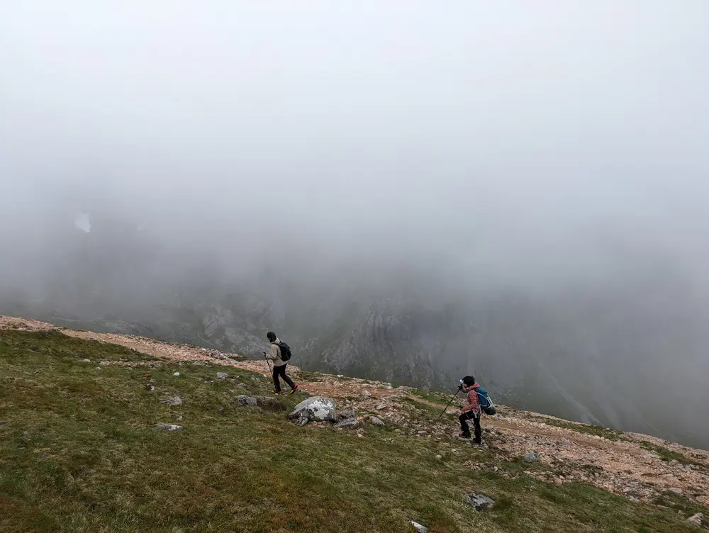 周日7点天刚亮我们就醒来,吃了混着咖啡粉的麦片糊糊。一夜过去,忐忑不减。周六还阳光明媚,让人抱怨没带够水的Beinn Nibheis,只过了一天就隐遁于雾气之中,并且用密雨惩罚挑战它的人们。我们从营地光走到CMD的起点就翻过了几座小山。等真正爬上山脊,已经过了几个小时,目力所及只有满眼的云雾,和脚下狭窄的道路(就是右上照片里那种路)。