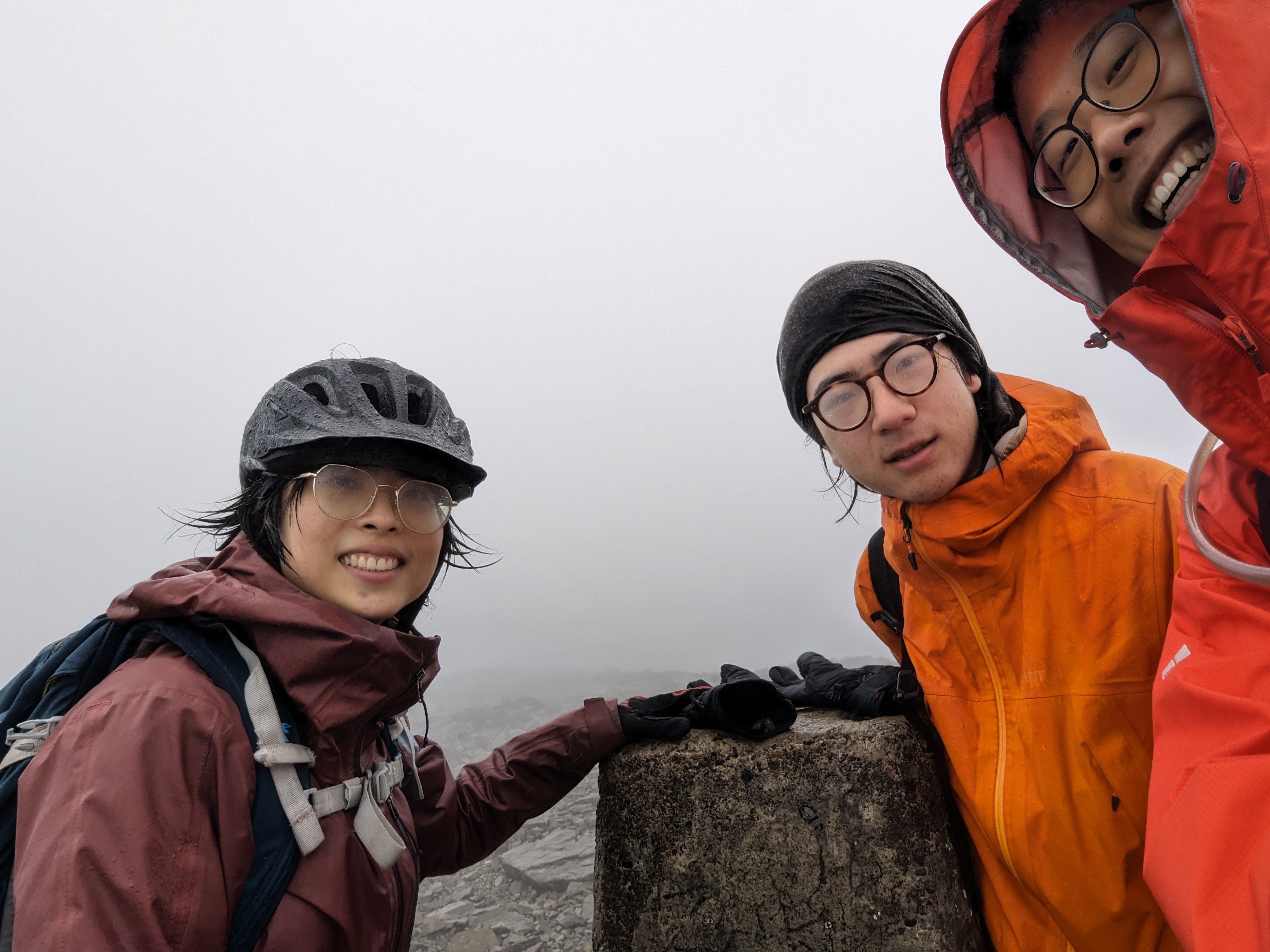 终于,我们来到了山顶。没有人么?也许是因为雾太大而看不见?我们进了狭小的避难所、围着三角点合影后还是看不见人。只在天文台废墟旁发现了不知道谁掉下的Vibram鞋底。临行前同事跟我说:“你已经熟悉苏格兰的天气了,我爬过两次Ben Nevis,每次登顶都是浓雾,完全看不到山下。”原来不仅山下看不到,两米外的景色也看不到,人更是没有。我们登顶后来到的是一片被雾气抱住的独立世界。
