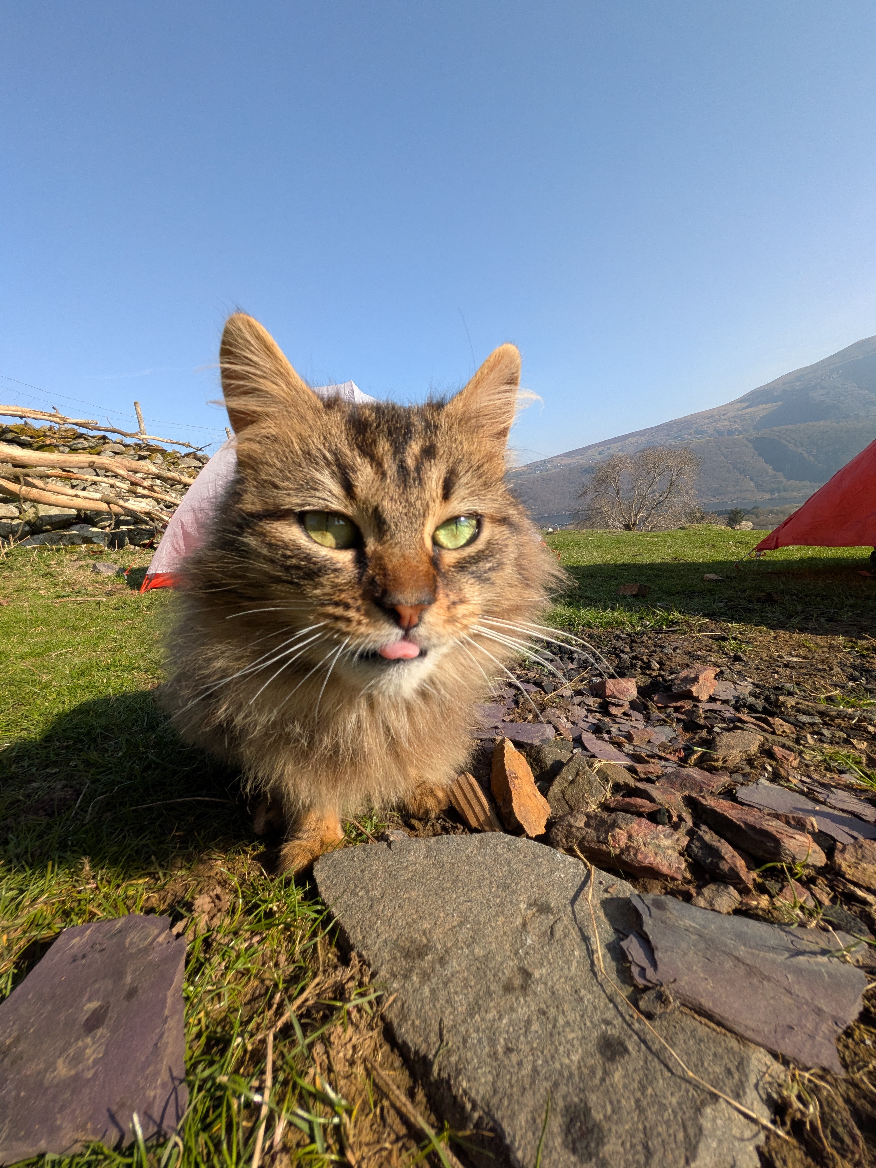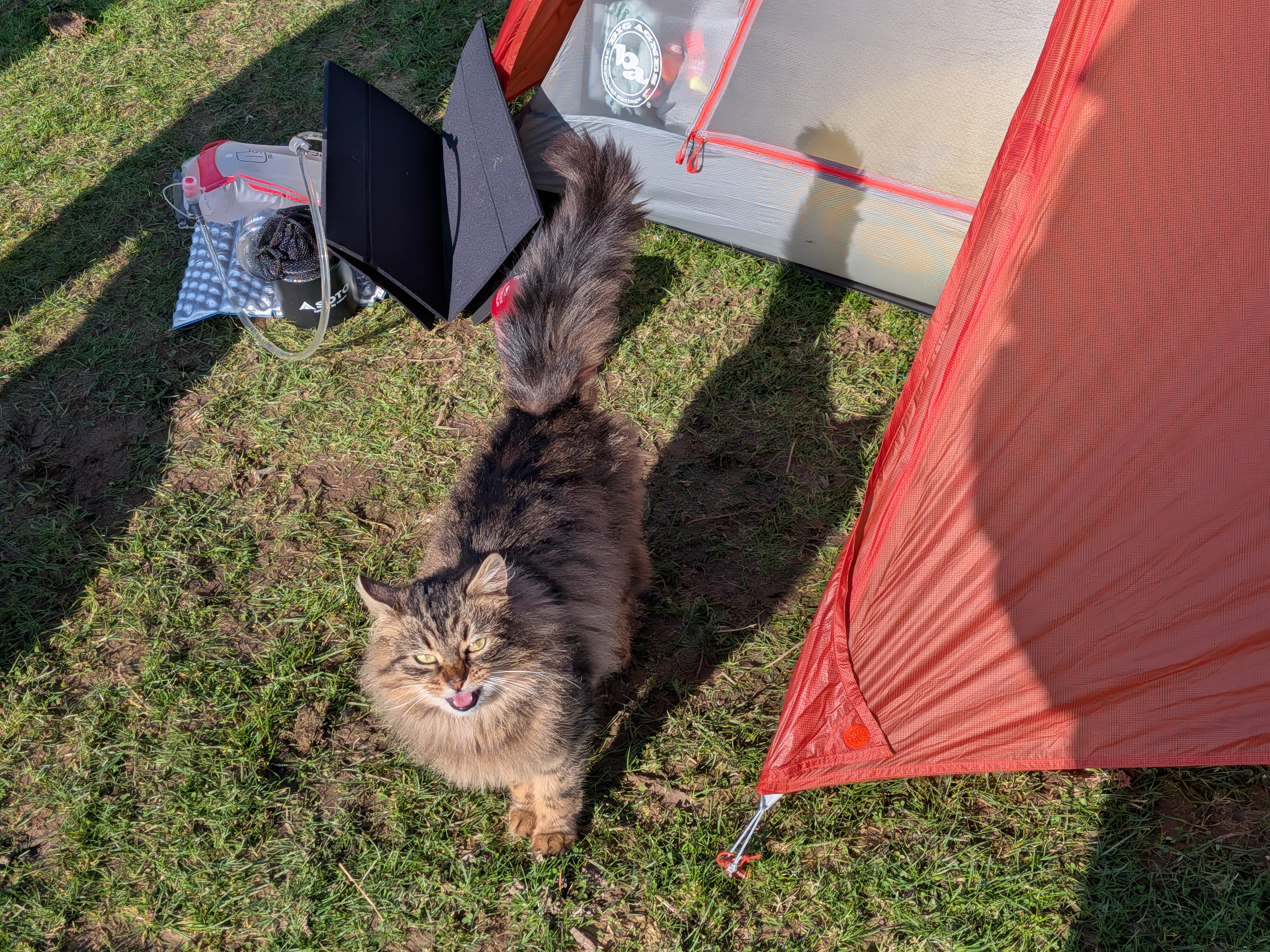 营地里有只长毛猫,会过来蹭你管你要吃的,也会坐在地垫上不让你支帐篷。第一天夜里我感觉有爪子隔着帐篷拨拉我手指,动了动又感觉有嘴巴咬我——还好帐篷没漏。