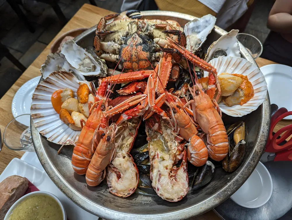 更让我开心的是吃上了第一次路过时没吃到的Crannog。虽说是Lonely Planet推荐,其实没有很好吃。我们点了个海鲜盘“Grand Platter”,有从Oban到Shetland的海鲜,结果朋友们怀疑其中螃蟹是生的。我寻思第一个吃螃蟹的人大概吃的也是生的,所以没多想就咬开啃了。然后又听说螃蟹死了会释放毒素而感到害怕,在旁边的咖啡馆要了杯姜黄奶,灌进胃里给螃蟹消毒。事后证明,一点事也没有。