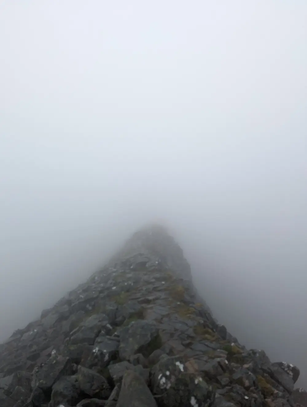 我不喜欢走这种碎石滩,它们让我想起在湖区困在The Screes的经历。顺着碎石滩爬升——我们能感觉到这是最后的爬升,因为我们已经没力气应对更多的爬升了。迎接胜利的不是曙光,而是前人垒砌的石堆。因为浓雾的原因,就连这些标识也要凑近了才能看到。在充满雾气的世界行走,宛如进了游戏的boss房。如果真是游戏的话,那我们的体力条绝对已经见底了。