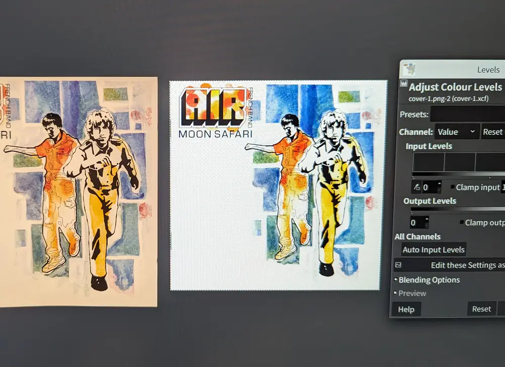 最难的是修复扫描结果的色彩。专业级的扫描仪就像专业级的显示器一样,是要校准的。我的扫描仪是——不能说得太狠,会伤我同学的心,总之,需要后期调整才更接近肉眼看到的样子。出于简单的原因,我采用调整Colour Levels的方式来调整色彩:只需要选出图片中应该为纯黑和纯白的部分,GIMP就会自动帮忙调整所有色彩。