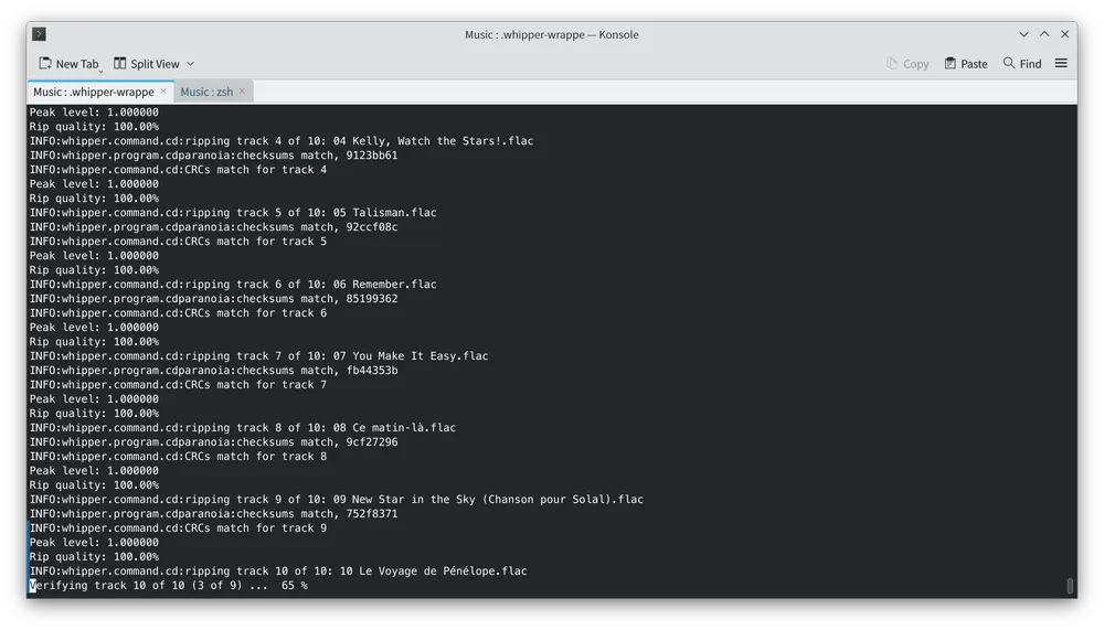 我在今年夏末又切回了Linux,而且我不打算研究Wine,所以我就得另辟蹊径使用别的软件rip了。最后选择的软件是Whipper——它可以帮助你调整光驱的offset;它可以在MusicBrainz上使用CD的Table of Contents(TOC)来搜索Release id;它会耗尽光驱缓存、多次读取、和AccurateRip的数据库进行比对来确保读出完美的内容。只要设置好光驱、歌曲命名方式,输入whipper cd rip,享受三十分钟光驱痛苦的狞叫,即可得到一份忠实的声音拷贝。