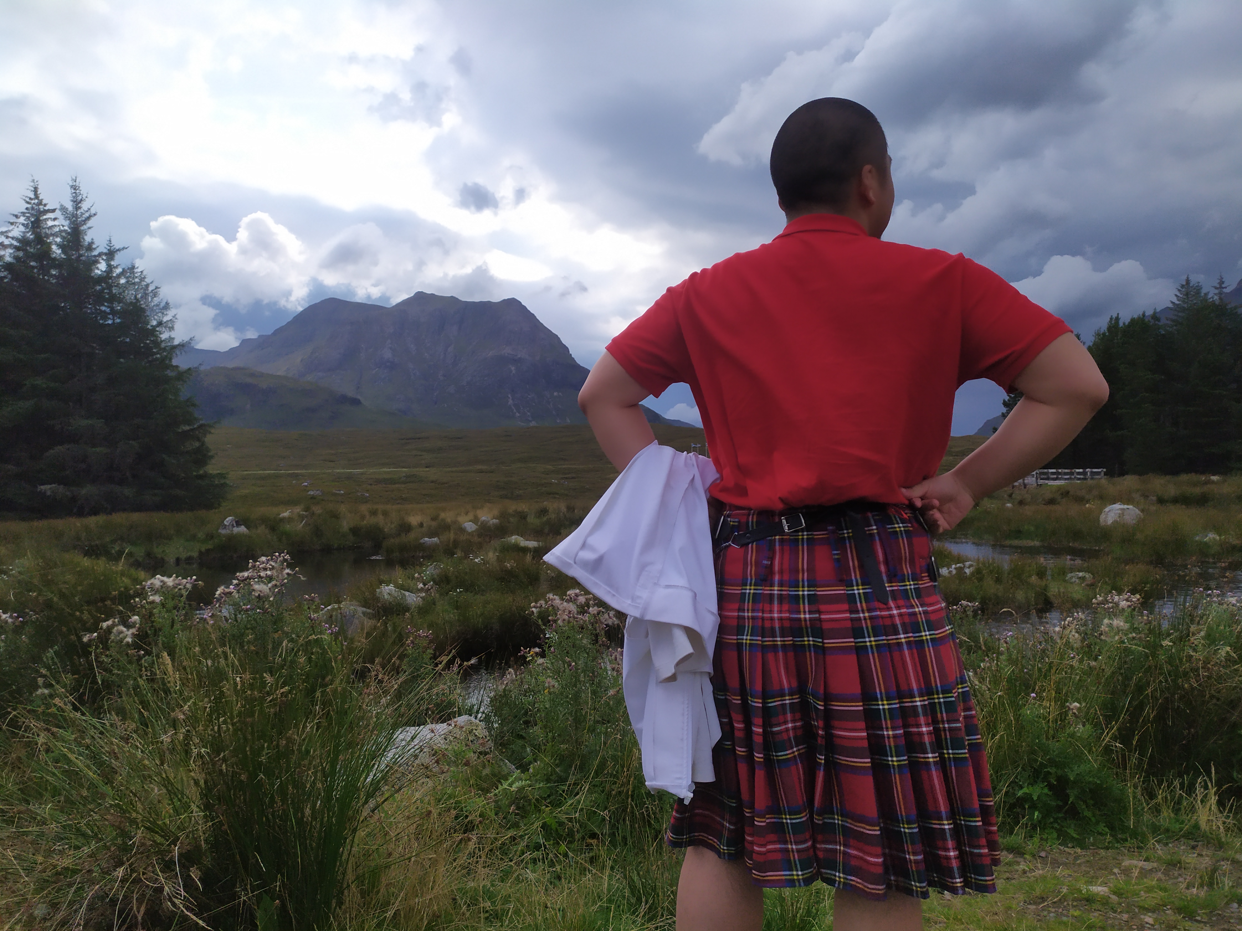 这次旅行有个跟团者特地买了条苏格兰短裙穿。不得不说,Royal Stewart和他的红色短袖很配。