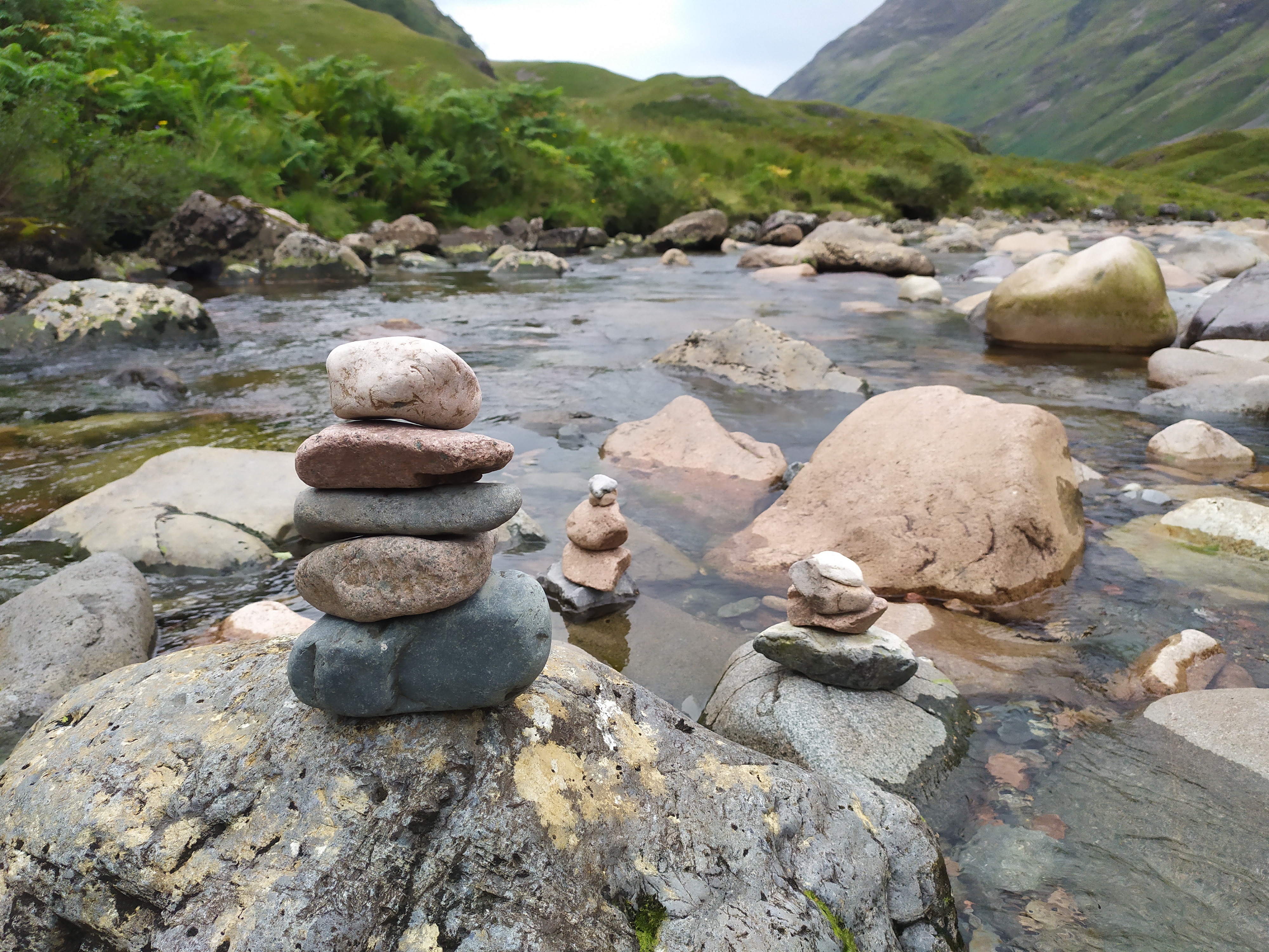 我喜欢踩草地,所以不走正道。谁承想,草地下的土壤吸满了水。我只有二十分钟自由活动时间,所以跑得飞快,自然也没注意到泥巴强大的黏力——直到我的鞋被黏掉了。这就是跟团游的弊端:着急。我在三姐妹山脚的小溪里看到三柱平衡垒石。 想必堆石头的游客在从容地自由行吧。