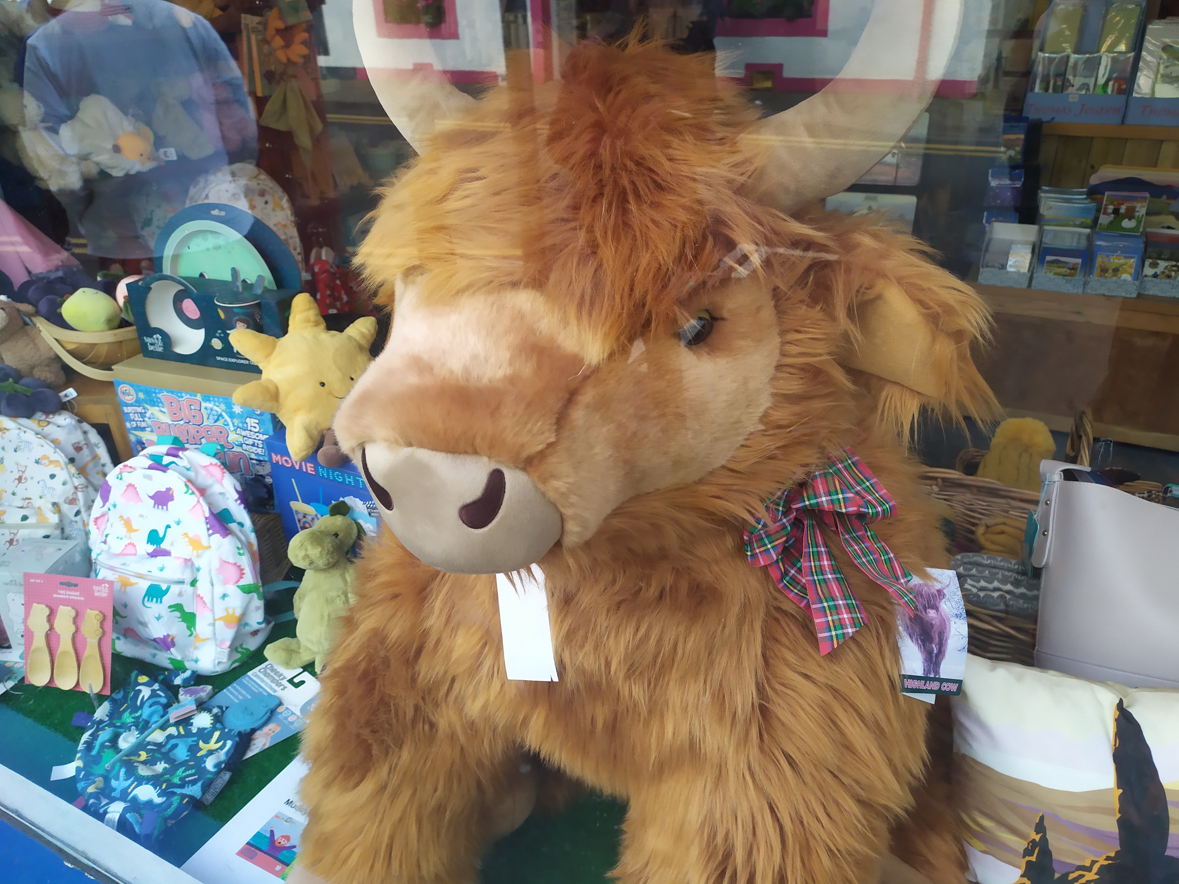 商店里有好大的高地牛玩偶,我觉得比真的牛可爱。