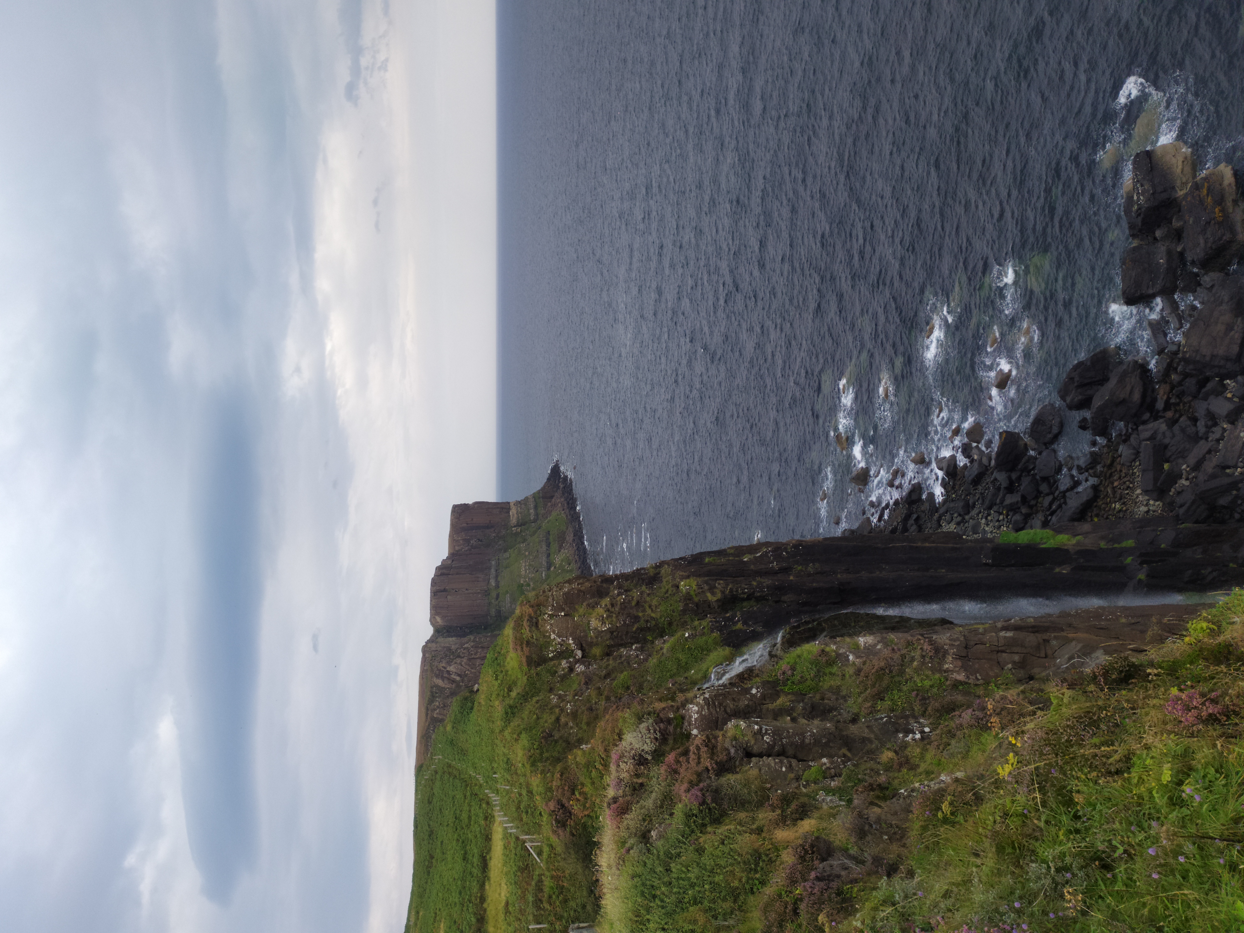 翻译成中文是“像苏格兰裙的岩石”。图中最远处的岩石可以清晰地看出有上下两层。上层是硬的玄武岩,下层是软的砂岩,确实有些像苏格兰裙。