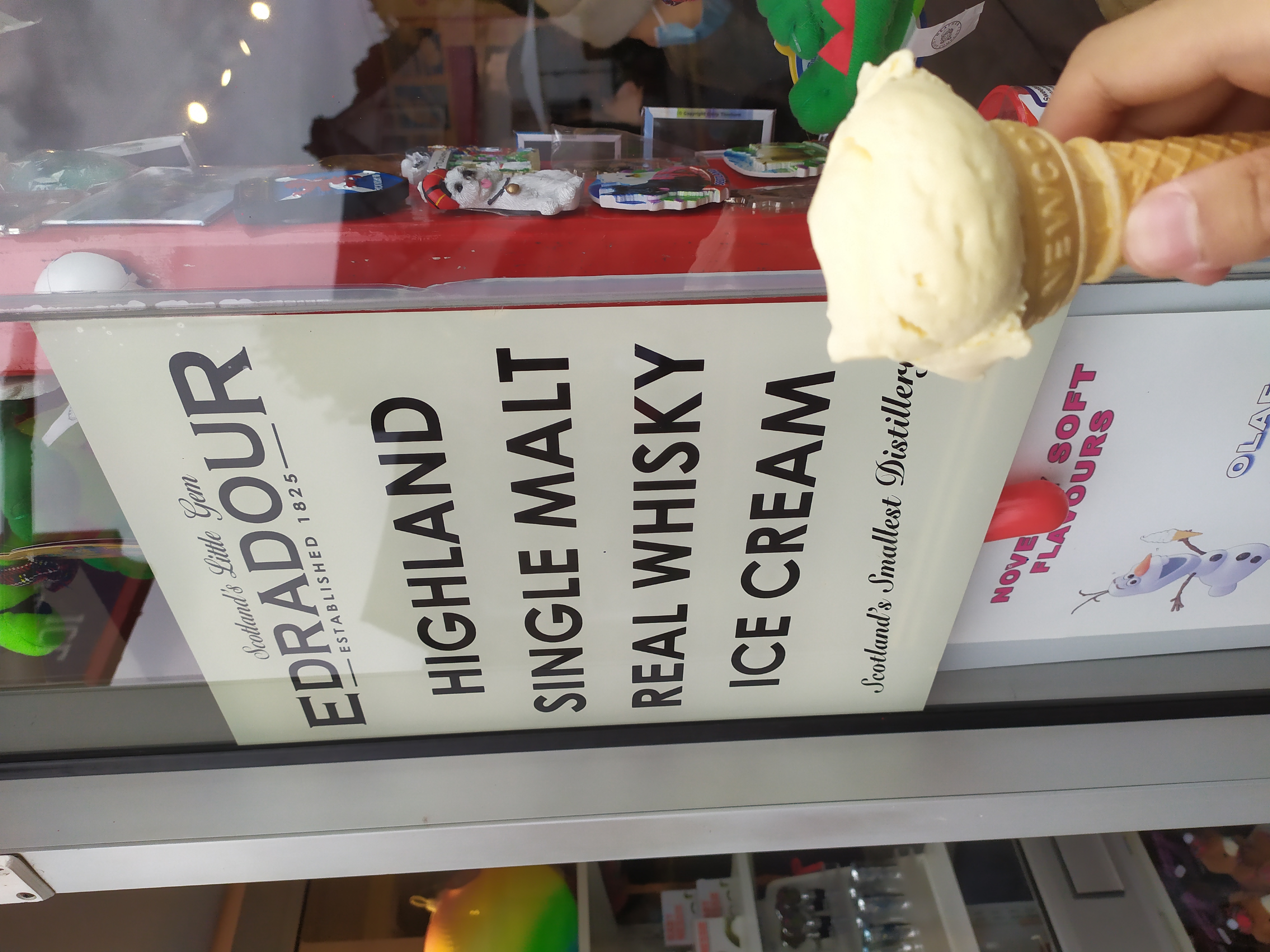 去圣安德鲁斯路过的小镇。这趟旅行可能是真没啥景点了,特意让我们吃这小镇的冰淇淋。这冰淇淋主打混有苏格兰最小酒厂威士忌的口味,味道还行,就是八喜朗姆味。另外吃起来粘牙,怀疑胶放多了。